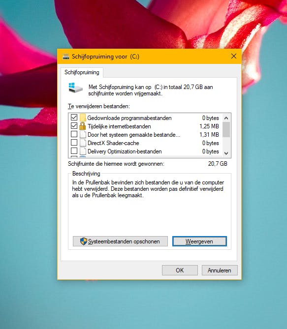 De eerste stap naar het oplossen van een probleem is je realiseren dat je een probleem hebt. Dat weet Microsoft ook en het bedrijf heeft wel degelijk in de gaten dat Windows zelf er soms een behoorlijke puinhoop van kan maken. Om die reden komt Windows tegenwoordig met een programma dat speciaal bedoeld is om je harde schijf op te ruimen. Je vindt dit programma door Schijfopruiming te typen in het menu Start, en te klikken op het gevonden pictogram. Er verschijnt nu een klein venster waarin direct duidelijk wordt wat er nog allemaal op te ruimen valt binnen Windows. Wanneer je dit net hebt gedaan zal dit waarschijnlijk gaan om enkele MB’s, maar draai je dit programma voor het eerst of na lange tijd, dan zul je zien dat je met één muisklik tot soms wel tiengallen gigabytes aan ruimtewinst kunt boeken. Vink de onderdelen aan die je graag wilt verwijderen en klik vervolgens op OK. Je hoeft niet bang te zijn dat je onderdelen weggooit die essentieel zijn voor het functioneren van Windows: die onderdelen worden in dit venster niet getoond.