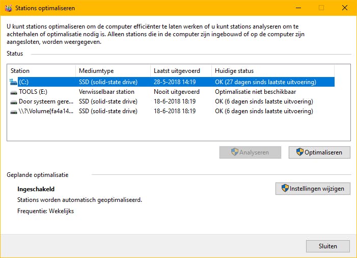 “Je moet je harde schijf even defragmenteren”: het was vroeger de magische zin van de pc-kenner om mensen te helpen met een pc die plotseling steeds trager werd. Tegenwoordig hoeven we dat eigenlijk niet meer te doen, niet (alleen) omdat de technologie zo verbeterd is, maar ook omdat Windows 10 automatisch wekelijks een defragmentatiesessie uitvoert. Wil je echter zelf alsnog je schijf defragmenteren doe je dit door in Verkenner te rechtsklikken op het C:-station en vervolgens te klikken op Eigenschappen. In het venster dat verschijnt klik je op Extra en vervolgens op Optimaliseren. Je krijgt dan een overzicht te zien van wanneer er voor het laatst een defragmentatie- en optimalisatiesessie is uitgevoerd en door te klikken op de knop Optimaliseren kun je zelf per direct zo’n sessie starten. Verwacht geen wonderen, maar het kan wél net even het verschil maken. Beschikt je systeem over een ssd-schijf, dan is defragmeteren af te raden. Windows zal dit uit zichzelf niet doen. Handmatig starten van een defragmentatie is beter van niet.