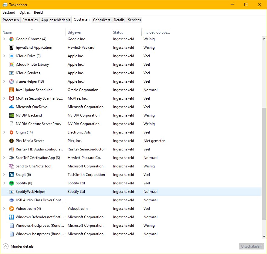 Elders in dit artikel lees je een tip over het verwijderen van programma’s die je niet meer gebruikt. Soms worden programma’s automatisch gestart wanneer je Windows start, waardoor de prestaties van het besturingssysteem beïnvloed worden. Dergelijke programma’s hoef je niet direct volledig te verwijderen, je kunt er ook gewoon voor zorgen dat ze niet langer automatisch worden gestart wanneer Windows start. Je doet dit door Taakbeheer te typen in het menu Start en vervolgens te klikken op Taakbeheer. In het venster dat verschijnt klik je op Opstarten. Je ziet nu een overzicht van alle programma’s die automatisch gestart worden wanneer Windows start en waarschijnlijk zijn dat er een stuk meer dan je dacht. Klik op de programma’s die je wilt verhinderen om automatisch te starten en vervolgens op Uitschakelen. Het programma blijft gewoon op je computer staan, maar start nu alleen als jij dat wilt. Let overigens wel op wat je uitschakelt, er staan waarschijnlijk ook programma’s tussen die nuttig zijn (wanneer je Dropbox uitschakelt, schakel je bijvoorbeeld ook de synchronisatie uit).