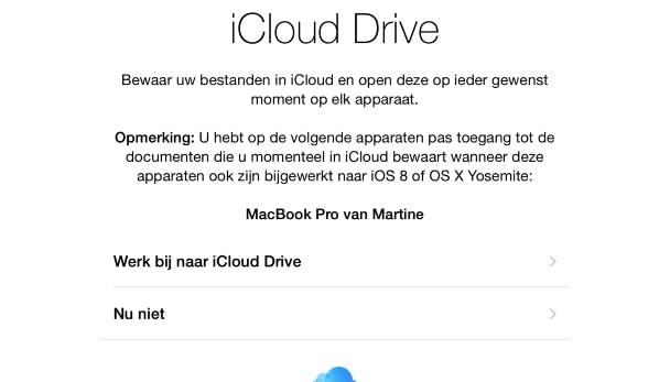 Let op: dit is niet meer terug te draaien. Houd er rekening mee dat je alleen zult kunnen delen met andere iOS-apparaten indien zij op iOS 8.x, Windows of OS X Yosemite draaien. Veel mensen realiseren zich niet dat wanneer ze een iPhone 4 hebben met iOS 7, dat zij documenten in Pages niet meer kunnen delen met Pages op een iPad Air met iOS 8 (dat kon met iCloud 'oude stijl' dus wel). Dat is iets om bij stil te staan.