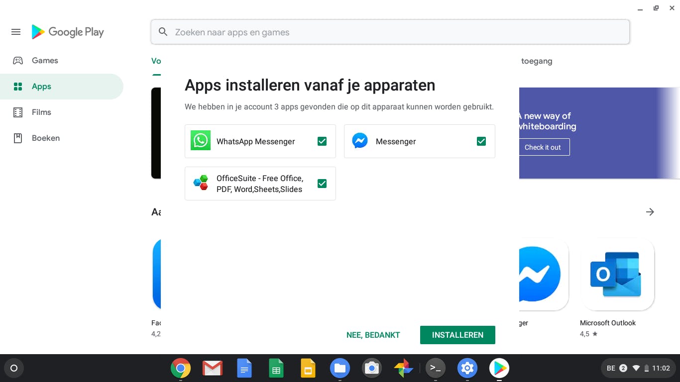 Android-apps die je op je telefoon of tablet hebt staan, worden niet automatisch met je Chromebook gesynchroniseerd, maar Google Play controleert wel welke van de apps die je op andere apparaten hebt draaien zijn ondersteund en stelt voor om deze op je Chromebook te installeren. Vink ze aan en klik op Installeren als je dat wilt.