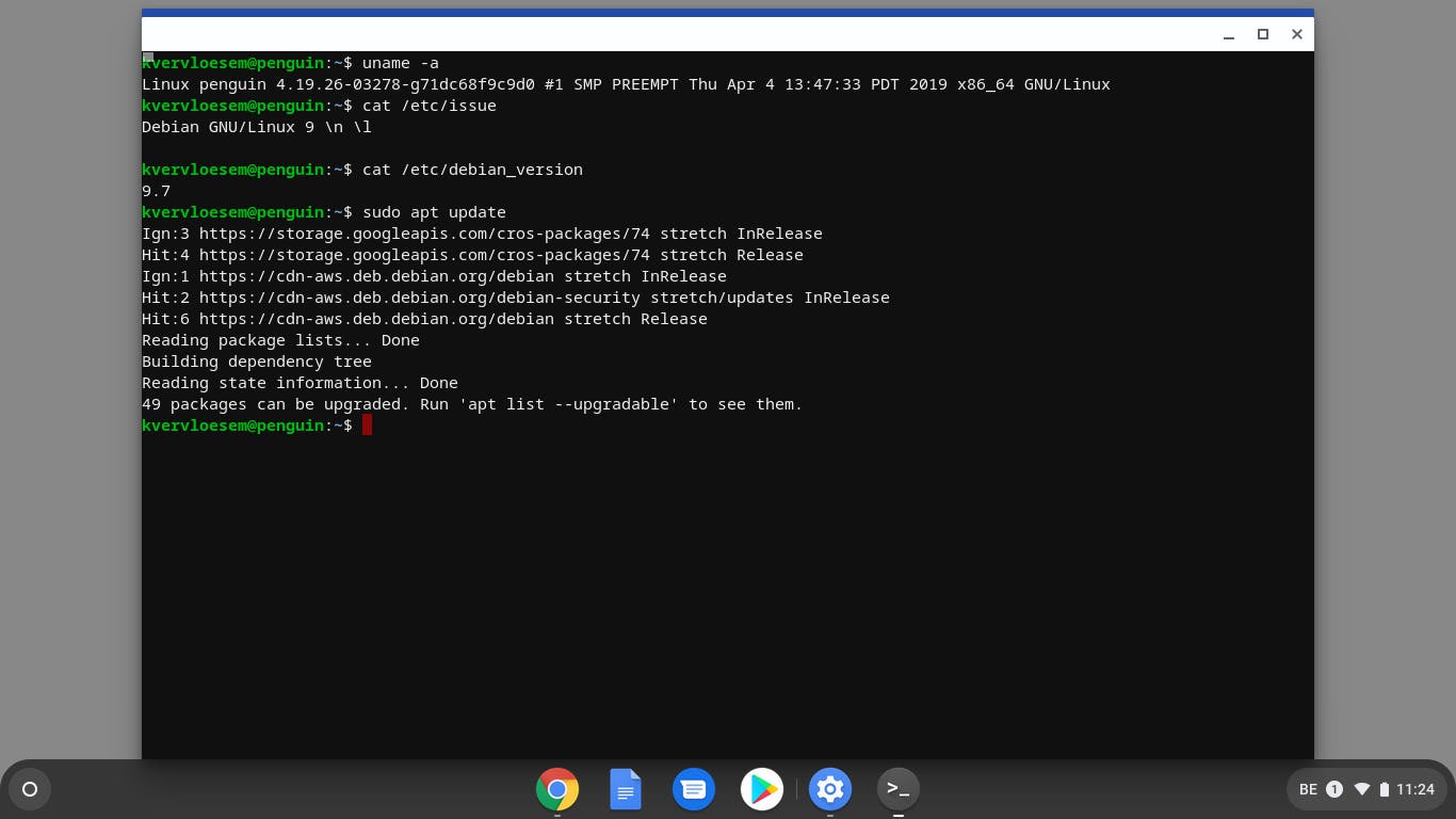 Daarna hoef je de terminal niet meer te gebruiken, maar je dient wel het venster open te houden om het updateprogramma voldoende rechten te geven. Start via de launcher van Chrome OS het programma Updateprogramma voor pakketten. Dat zoekt naar updates voor je Linux-container en klik op Install Updates. Overigens installeert Chrome OS dagelijks automatisch de nieuwste updates in je Linux-container, dus mogelijk zie je hier geen updates en in principe hoef je dit programma niet te draaien, maar voor de zekerheid doe je het best één keer zodat je daarna software kunt installeren.
