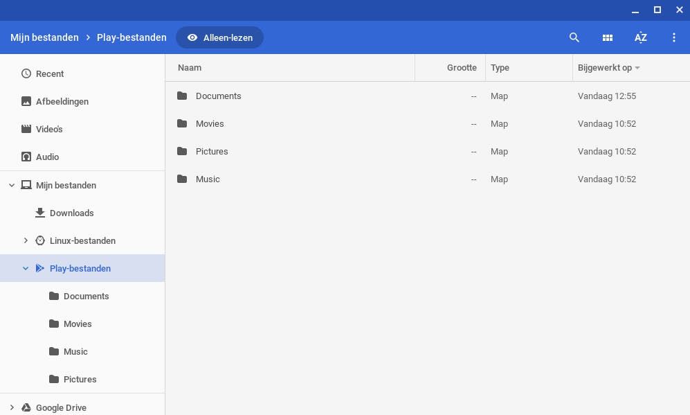 Android-apps die de machtiging Opslagruimte hebben, hebben toegang tot de map Play-bestanden van je persoonlijke map (Mijn bestanden) in Chrome OS. Om bestanden tussen Chrome OS en Android-apps uit te wisselen, gebruik je die map dus, die submappen voor documenten, films, muziek en afbeeldingen heeft. Ook je downloadmap wordt automatisch gedeeld. De bestandsuitwisseling tussen je Linux-programma’s en Chrome OS verloopt op vergelijkbare wijze: via de map Linux-bestanden, die in de Linux-container als je persoonlijke map aangekoppeld is, en de downloadmap die in de Linux-container als /mnt/chromeos/MyFiles/Downloads/ aangekoppeld is. Bestandsbeheer doe je in Chrome OS overigens met het programma Bestanden.