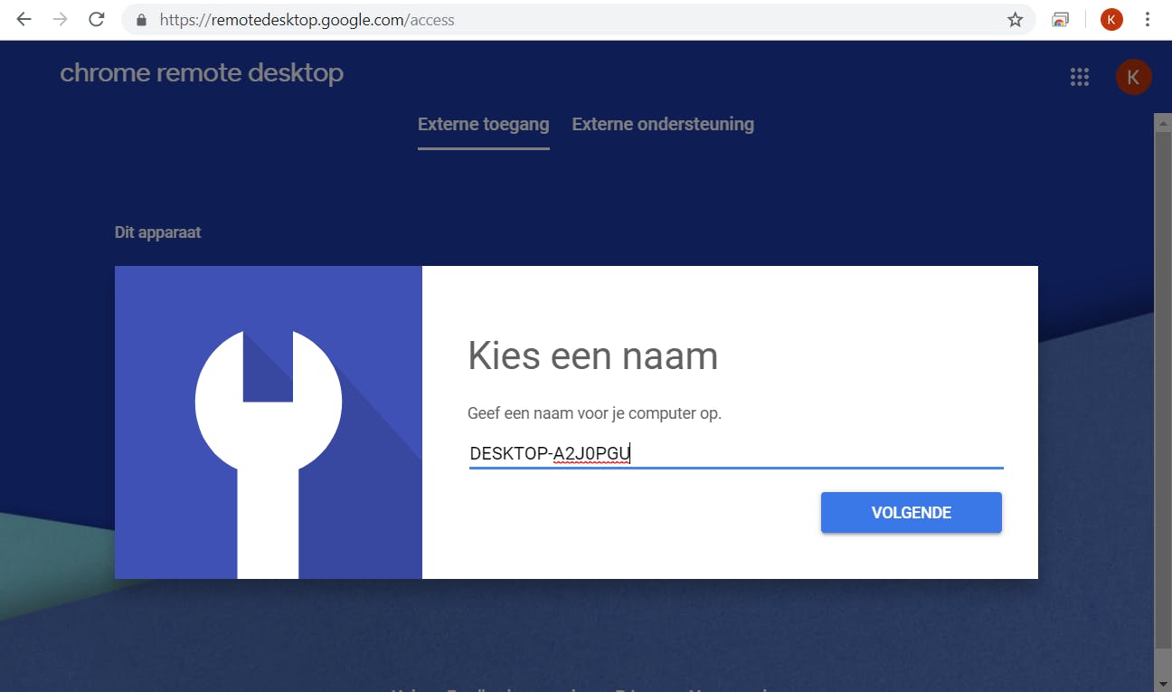 Op je Windows-computer dien je in Chrome deze pagina te bezoeken. Klik dan onder Externe toegang instellen op het downloadknopje, voeg de web-app Chrome Remote Desktop toe aan Chrome en installeer het gedownloade programma Chrome Remote Desktop Host. Kies dan in Chrome een naam voor je computer, een pincode van minstens zes cijfers en klik op Starten.