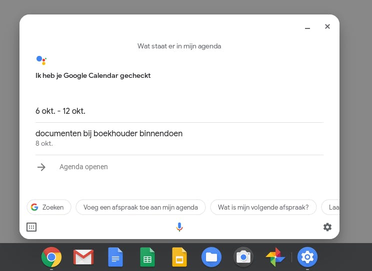 Vanaf Chrome OS 77 is ook de Google Assistent in Chrome OS aanwezig. Normaal is Google Assistent standaard ingeschakeld, maar luistert hij nog niet naar “Oké Google”. Kijk dat in de instellingen van Chrome OS na onder Google Zoeken en Google Assistent. Bij Google Assistent zie je normaal gesproken Ingeschakeld staan.