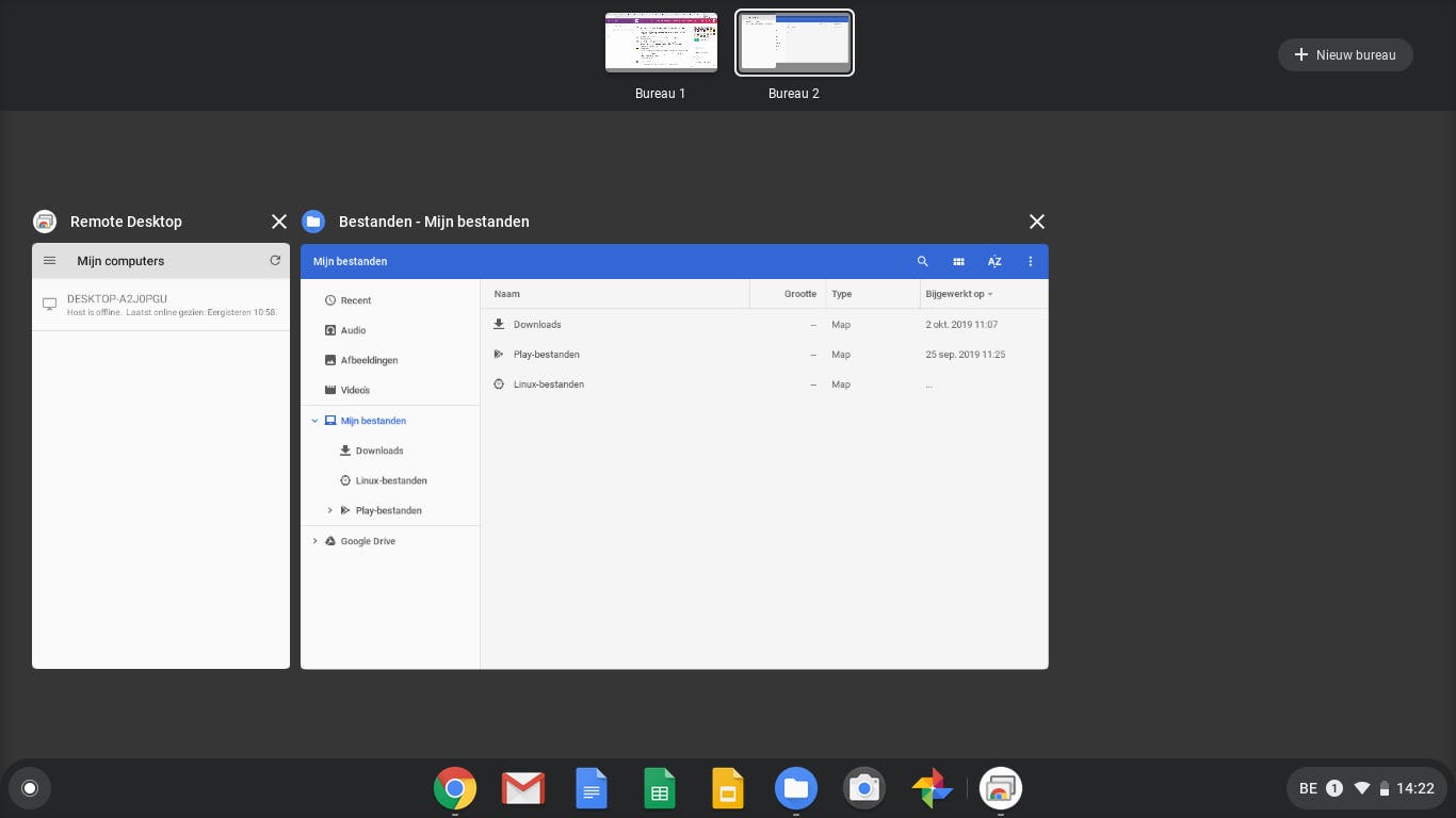 Bovenaan in het midden zie je nu dat je twee bureaubladen hebt: Bureau 1 en Bureau 2. Klik je op die tweede, dan krijg je een leeg bureaublad te zien. Alle vensters die je nu opent, komen hierop. Klik je op het icoontje van een al geopend programma in het paneel onderaan, dan schakel je over naar het bureaublad waarin dit programma geopend is. In het overzichtsscherm kun je ook vensters naar een ander bureaublad verslepen. Als je serieus aan de slag wilt met je Chromebook als Windows-vervanger, komen virtuele desktops goed van pas.