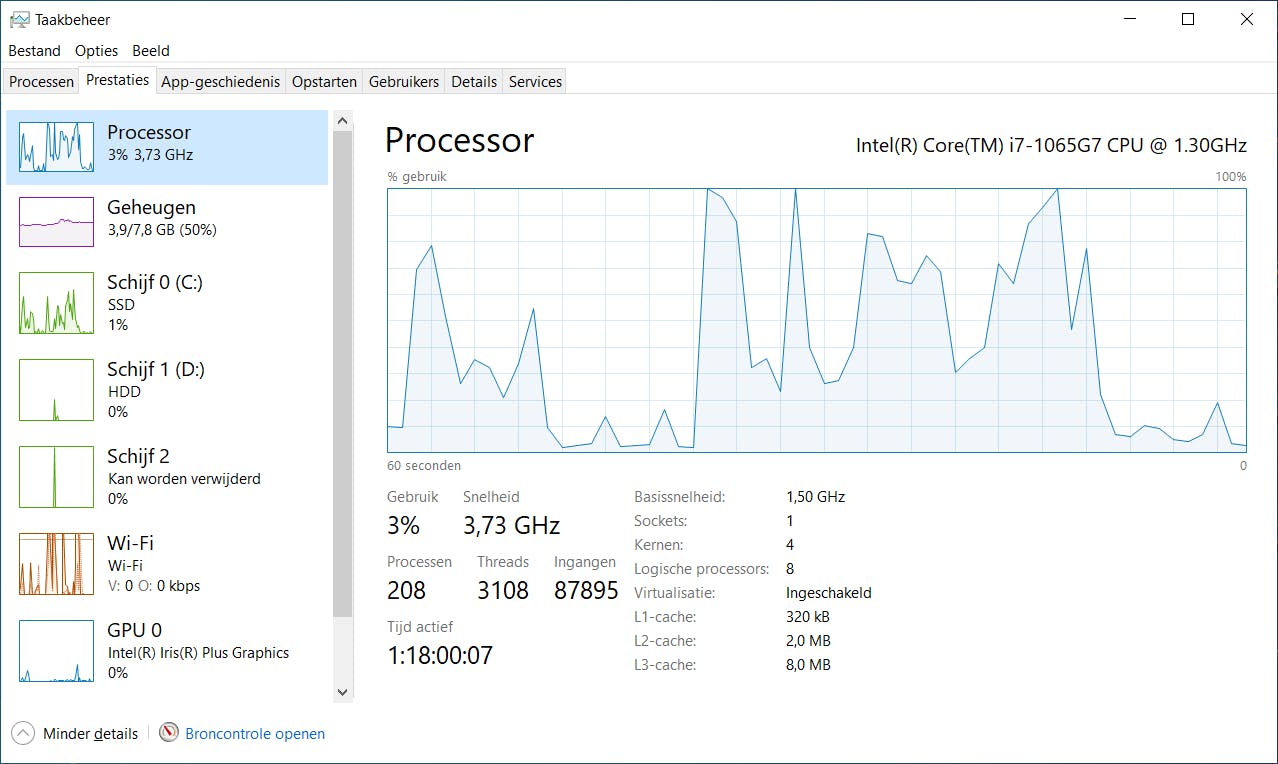 De cpu en gpu bepalen dus beide in grote mate hoe krachtig je systeem is, maar hoe kom je er nu achter hoe zwaar je systeem die processors op een gegeven ogenblik belast? Dat kun je vanuit Windows zelf doen. Open het taakbeheer (met Ctrl+Shift+Esc) en ga naar het tabblad Prestaties. Je kunt hier het realtime gebruik van elke primaire systeembron bekijken; naast processor en gpu ook geheugen, schijf en netwerk via wifi en/of ethernet. Open Beeld / Bijwerksnelheid om de standaardperiode van 60 seconden aan te passen naar 30 seconden of 4 minuten.