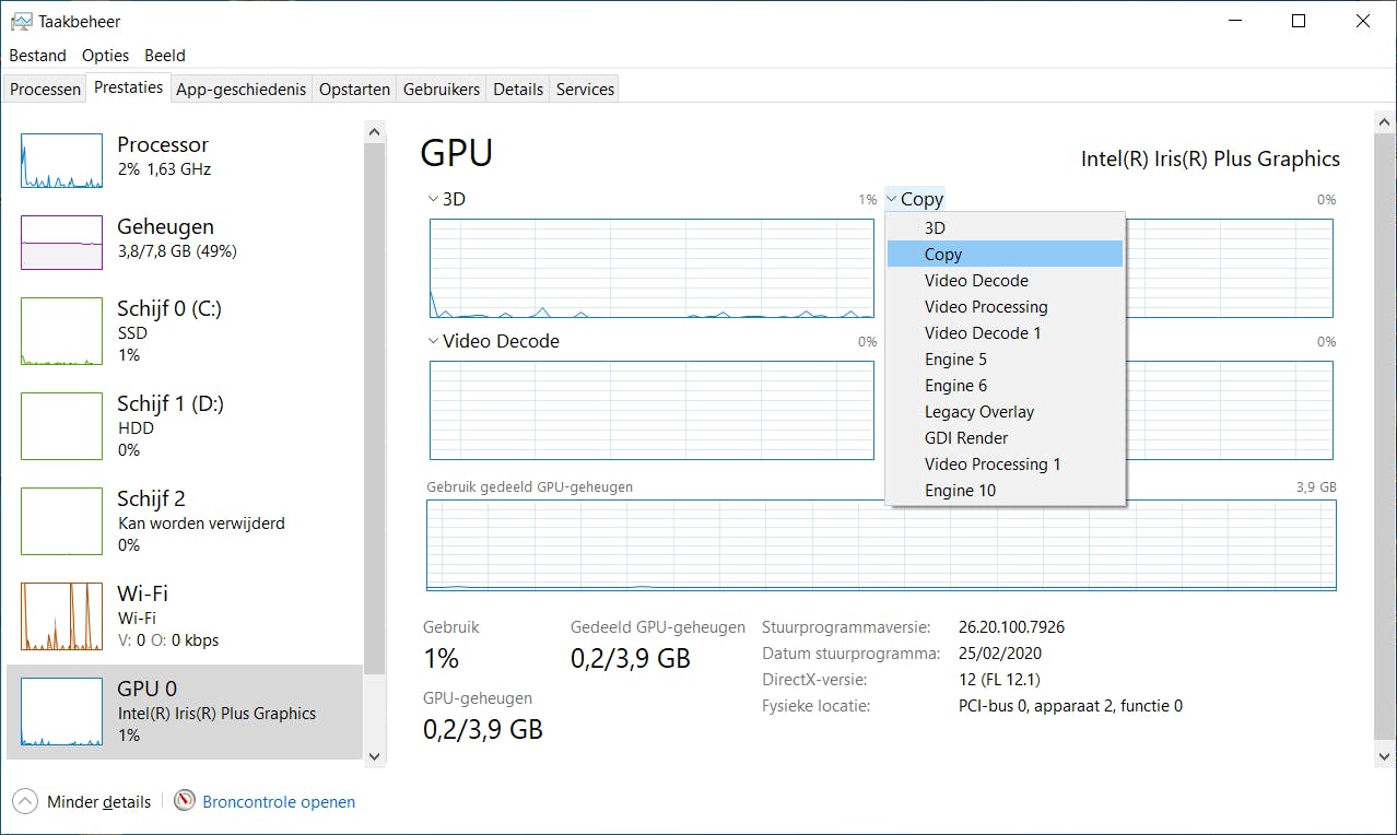 De cpu-informatie op het tabblad Prestaties is rechttoe rechtaan, want beperkt tot één enkel gebruikspercentage, terwijl dat bij de gpu duidelijk complexer is. In het kader ‘Gpu intern’ lees je hier meer over.