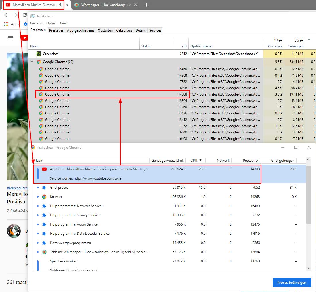 Daarvoor kun je bij de browser zelf aankloppen. Ga naar Chrome en kies Meer programma’s / Taakbeheer: in de kolom Taak lees je nu mooi af welke taak met welke PID overeenkomt. Klik met rechts op een kolomtitel voor nog meer informatie. Ook andere browsers hebben een vergelijkbaar taakbeheer ingebouwd.
