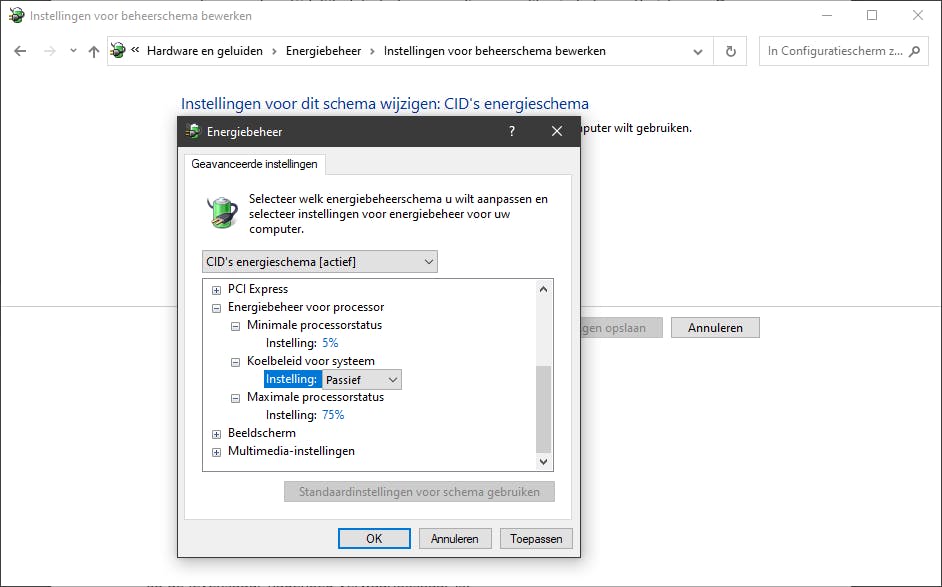 Vervolgens klik je naast je eigen schema op De schema-instellingen wijzigen en kies je Geavanceerde energie-instellingen wijzigen. Open de rubriek Energiebeheer voor processor en stel zowel de Minimale als de Maximale processorstatus in. Stel deze laatste bijvoorbeeld in op 75% als je de cpu nooit maximaal wilt laten belasten.