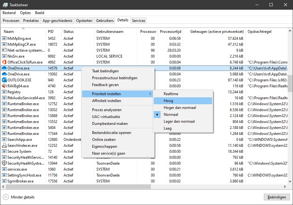 Je kunt nu zelf bepalen hoeveel cpu-bronnen je aan (de threads van) processen geeft. Open hiervoor opnieuw Windows Taakbeheer en ga naar het tabblad Details. Klik met rechts op het gewenste proces en kies Prioriteit instellen. Standaard staat die ingesteld op Normaal, maar je kunt nog uit vijf andere prioriteiten kiezen: Laag, Lager dan normaal, Hoger dan normaal, Hoog en Realtime. Belangrijke processen kun je gerust instellen op Hoger dan normaal of Hoog, maar de instelling Realtime raden we af.