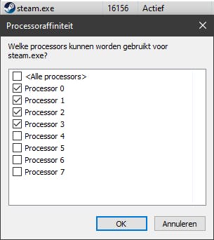 Het is in elk geval niet moeilijk om de affiniteit van een proces aan te passen. Daarvoor blijf je nog even op het tabblad Details van het taakbeheer. Klik opnieuw met rechts op een procesnaam en kies deze keer Affiniteit instellen. Je hoeft nu maar het vinkje te verwijderen naast de logische processors die je liever niet voor dit proces laat gebruiken.