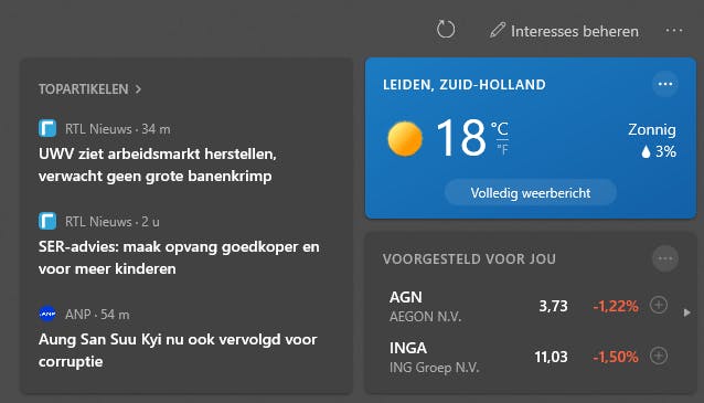 Als je op het icoontje klikt, krijg je nog meer te zien: niet alleen het weerbericht, maar ook een samenvatting van het laatste nieuws, beursinformatie, etc: