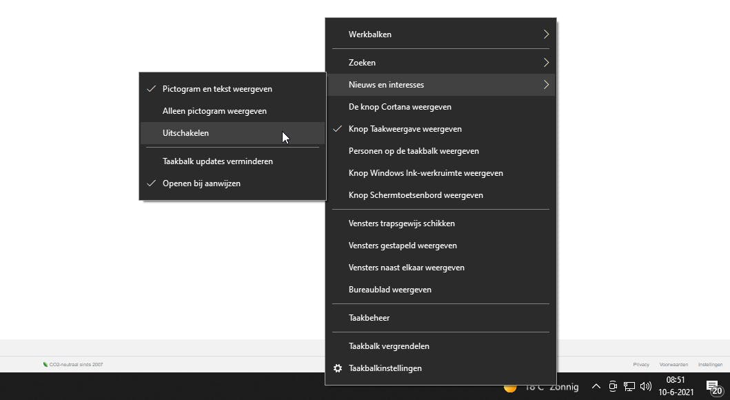 Klik in plaats daarvan met de rechtermuisknop op een lege plek in de taakbalk. Daar vind je het uitklapmenu Nieuws en interesses. Ga erop staan met je muis en klik in het submenu dat verschijnt op Uitschakelen. Je kunt ook kiezen voor alleen een icoontje, zonder tekst, dat minder opvalt, maar ook wel een heel summier weerbericht is.