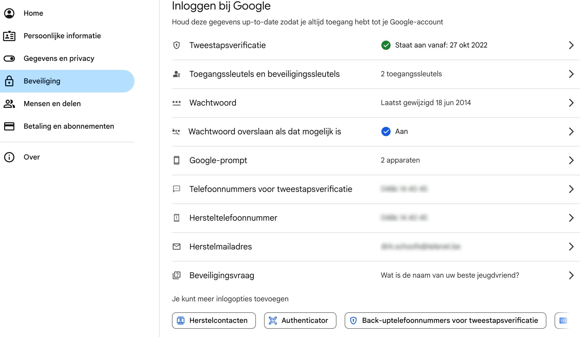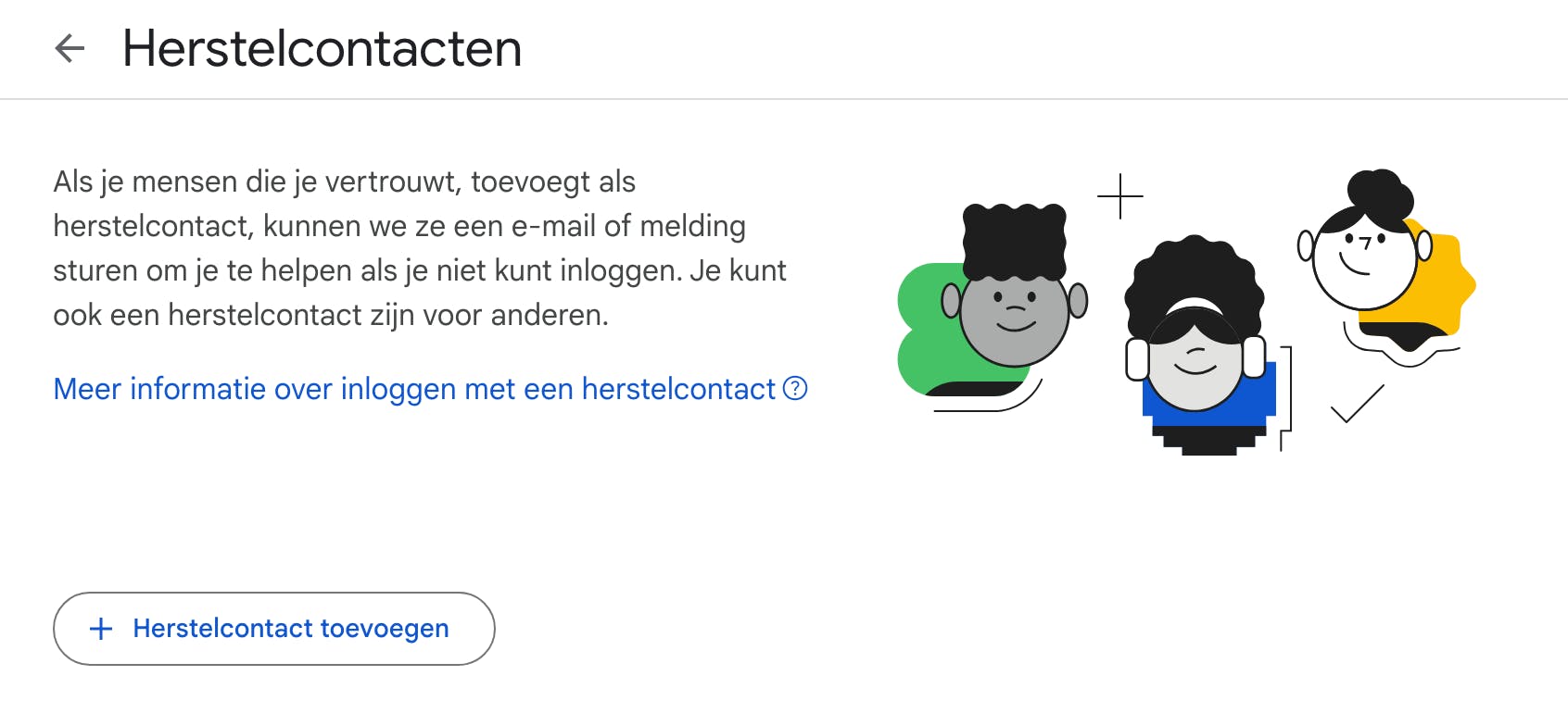 Er is een aantal manieren om zelf opnieuw toegang te krijgen tot je Gmail-account. Daarbij heb je een herstel-e-mailadres en -telefoonnummer nodig of tweefactorauthenticatie op een apparaat dat je misschien niet bij de hand hebt. Met Herstelcontacten kies je een vriend of familielid die helpt om je account terug te krijgen. Houd er rekening mee dat je dit herstelcontact minimaal zeven dagen moet hebben toegevoegd voordat je er gebruik van kunt maken. Je mag maximaal tien personen toevoegen als herstelcontacten. Deze personen moeten zelf ook Gmail-gebruikers zijn. Bovendien is het belangrijk te weten dat deze herstelcontacten nooit toegang krijgen tot je account. Ze ontvangen alleen een tijdelijke verificatiecode die na vijftien minuten afloopt. Ga in de desktopbrowser of op een mobiel apparaat naar de pagina Google-account. Daarna ga je naar Beveiliging en Inloggen bij Google. Hier klik je op de knop Herstelcontacten.