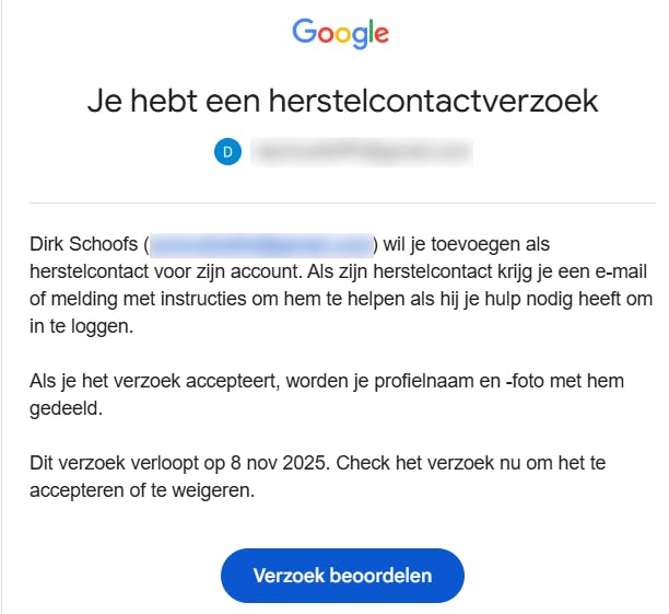 Je contactpersoon ontvangt een e-mail in zijn of haar Gmail-account met het verzoek om herstelcontact te worden. Na het klikken op Verzoek beoordelen wordt hij of zij naar de eigen accountpagina geleid. Door op het vinkje rechts te klikken, kan je vriend de uitnodiging aanvaarden.
