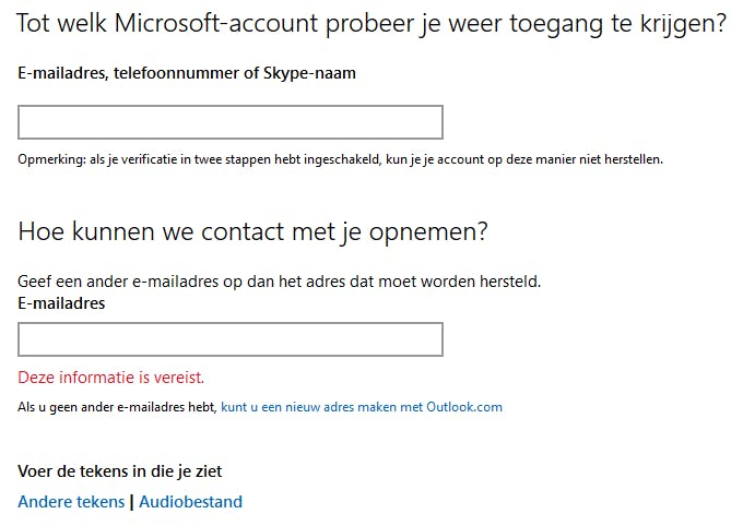 Bij het aanmaken van een Microsoft-account heb je het secundaire adres al moeten opgeven en die geef je hier op bij het veld Geef een ander e-mailadres op dan het adres dat moet worden hersteld.