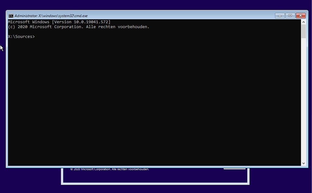 Om je vergeten wachtwoord te herstellen van een lokaal Windows 10-account, moet je gebruik maken van de hersteloptie van Windows 10. Daar kun je een bootable Windows 10-dvd of usb-stick voor gebruiken. Als je die nog niet hebt, dan kun je die via de Microsoft Media Creation Tool. Die tool kun je op de site van Microsoft downloaden. Start vervolgens je computer op met de dvd of de usb-stick, doorgaans kun je dat doen door na het starten van je pc meteen op de F10-knop te drukken en vervolgens het bootable apparaat (dvd of usb-stick) te kiezen. Je computer start vervolgens op van die drive. Nadat het eerste scherm van de bootable drive verschijnt, druk je de volgende toetscombinatie in: Shift+F10. Er verschijnt nu een command-prompt op de x:-drive, zoals hieronder: