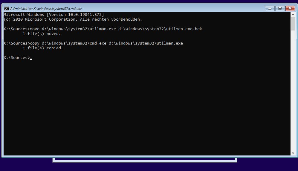 Hiermee wordt het bestand utilman.exe tijdelijk van een andere naam voorzien. Met het volgende commando ga je nu het uitvoerbare bestand voor de command-prompt kopiëren naar de plek waar eerst utilman.exe heeft gestaan en hernoem je die naar utilman.exe:
