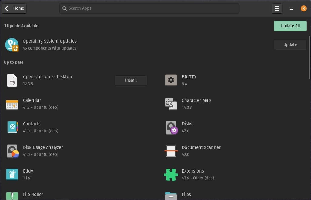 De Linux-distributie bevat van zichzelf al een aantal bruikbare programma's. Zo zijn Firefox en LibreOffice al geïnstalleerd en met een beetje geluk kun je daarmee al je werkzaamheden uitvoeren. Deze programma's zijn tenslotte ook voor andere besturingssystemen beschikbaar, waaronder Windows en macOS. Klik op Applications of Show Applications om alle beschikbare programma's te tonen. De tooltjes zijn over verschillende categorieën verdeeld. Klik bijvoorbeeld op Office om een tekstverwerker, rekenprogramma of tekentool te openen. De tool Geary is ook de moeite waard. Heb je in een eerder stadium een account van Google of Microsoft toegevoegd? Dan vind je hier de e-mails van Gmail of Outlook.com. Daarnaast vind je onder andere een rekenmachine, agenda, fotoviewer en videospeler.