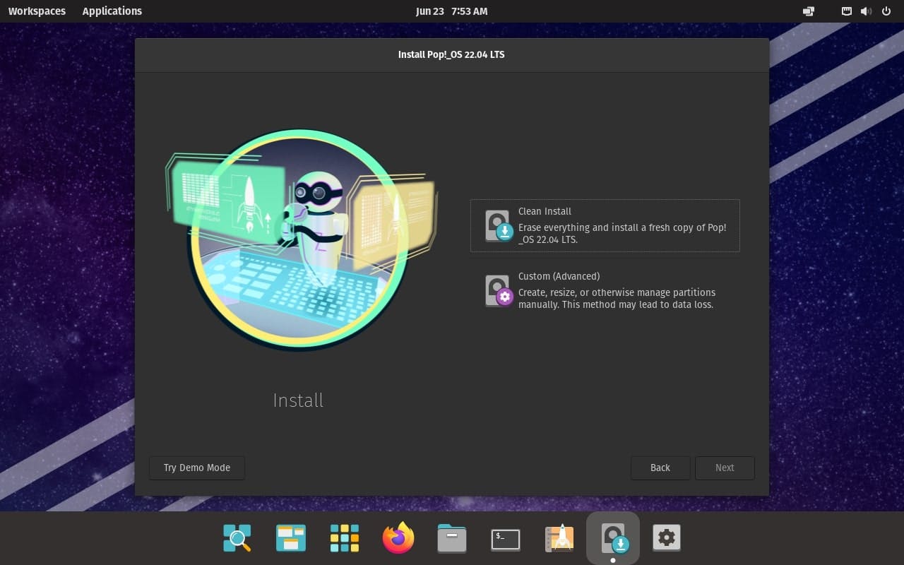 De volgende stap is erg belangrijk. Ga je het huidige besturingssysteem (bijvoorbeeld Windows 10) niet meer gebruiken, dan ligt een schone installatie voor de hand. Klik in dat geval op Clean Install. Een alternatieve optie is om Pop!_OS naast het huidige besturingssysteem te installeren. Je creëert daarmee een dualboot-systeem. Kies dan Custom (Advanced). In de volgende stap kun je dan eventueel een nieuwe partitie aanmaken.