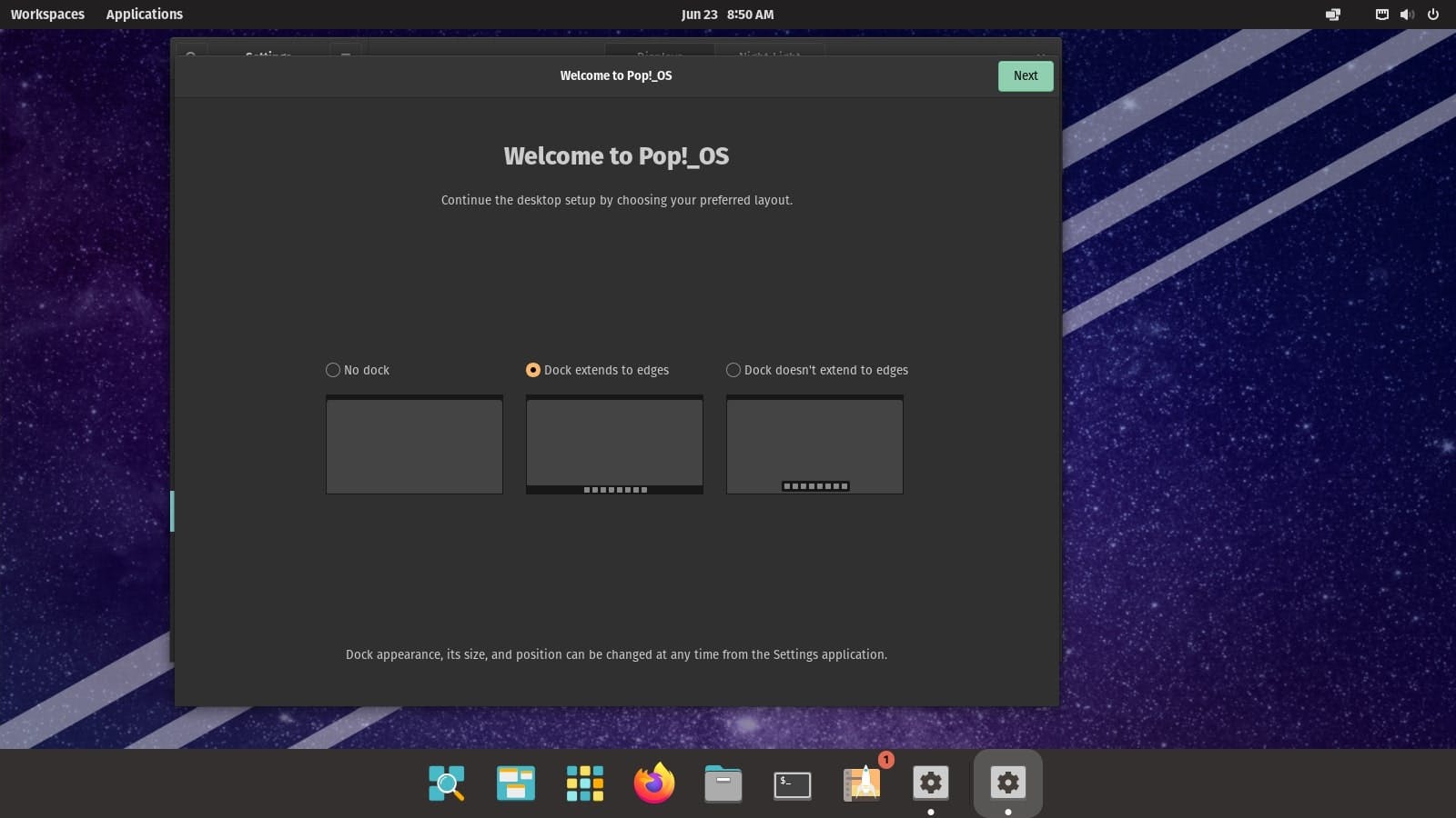 Je kunt met het welkomstvenster eerst wat instellingen naar je hand zetten. Wat de welbekende Taakbalk is voor Windows, is het zogeheten Dock voor Pop!_OS. Je kunt vanuit deze plek allerlei veelgebruikte programma's oproepen. Bepaal op welke wijze je het Dock wilt weergeven, namelijk met of zonder randen. Via Next beslis je of je de onderdelen Workspaces en Applications wilt tonen. Je leest in de volgende stappen welke functies dit veelzijdige besturingssysteem in petto heeft. Klik hiervoor meermaals op Next.