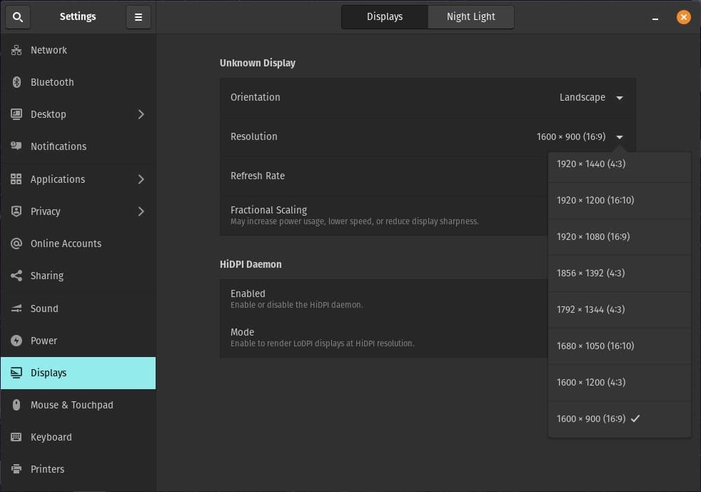 Pop!_OS stemt normaal gesproken de resolutie af op de gebruikte monitor. Je kunt de resolutie desgewenst wijzigen. Klik ergens met de rechtermuisknop op het bureaublad en kies Display Settings. Je klikt nu op Resolution, waarna je naar eigen inzicht een andere waarde instelt. Je kunt eventueel ook de nachtmodus activeren. Het besturingssysteem heeft dan tijdelijk warmere kleuren, waardoor je ogen 's avonds niet zo gauw vermoeid raken. Klik bovenaan op Night Light en zet de schakelaar aan. Geef aan op welke tijden je de nachtmodus wilt gebruiken.