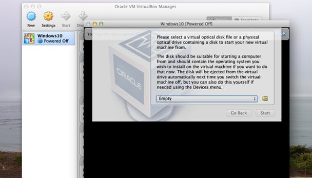 Een andere optie maakt het mogelijk om Windows als een virtuele machine te draaien binnen een OS X-programma. We gebruiken hier de open-source VirtualBox van Oracle, maar Parallels Desktop is een populair alternatief (maar kost ongeveer 80 euro). Een virtuele machine is de manier die we aanbevelen, aangezien de Windows 10 Technical Preview zich nog in een erg vroeg stadium bevindt, met wat ruige randjes en bugs. Als er op een virtuele machine iets verkeerd gaat zal het je hardware of OS X installatie niet aantasten - je kunt het gewoon wissen en opnieuw beginnen.