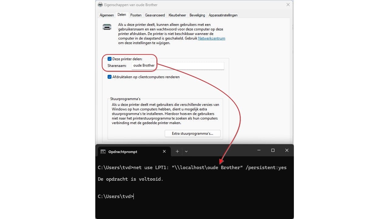 (met net use LPT1: /delete verwijder je deze koppeling). <printershare> is de gedeelde printernaam, zoals ingesteld via Instellingen in Windows: klik op de printernaam, kies Printereigenschappen en open het tabblad Delen. Zo kun je vaak nog printen vanuit oude DOS- of Windows-apps.