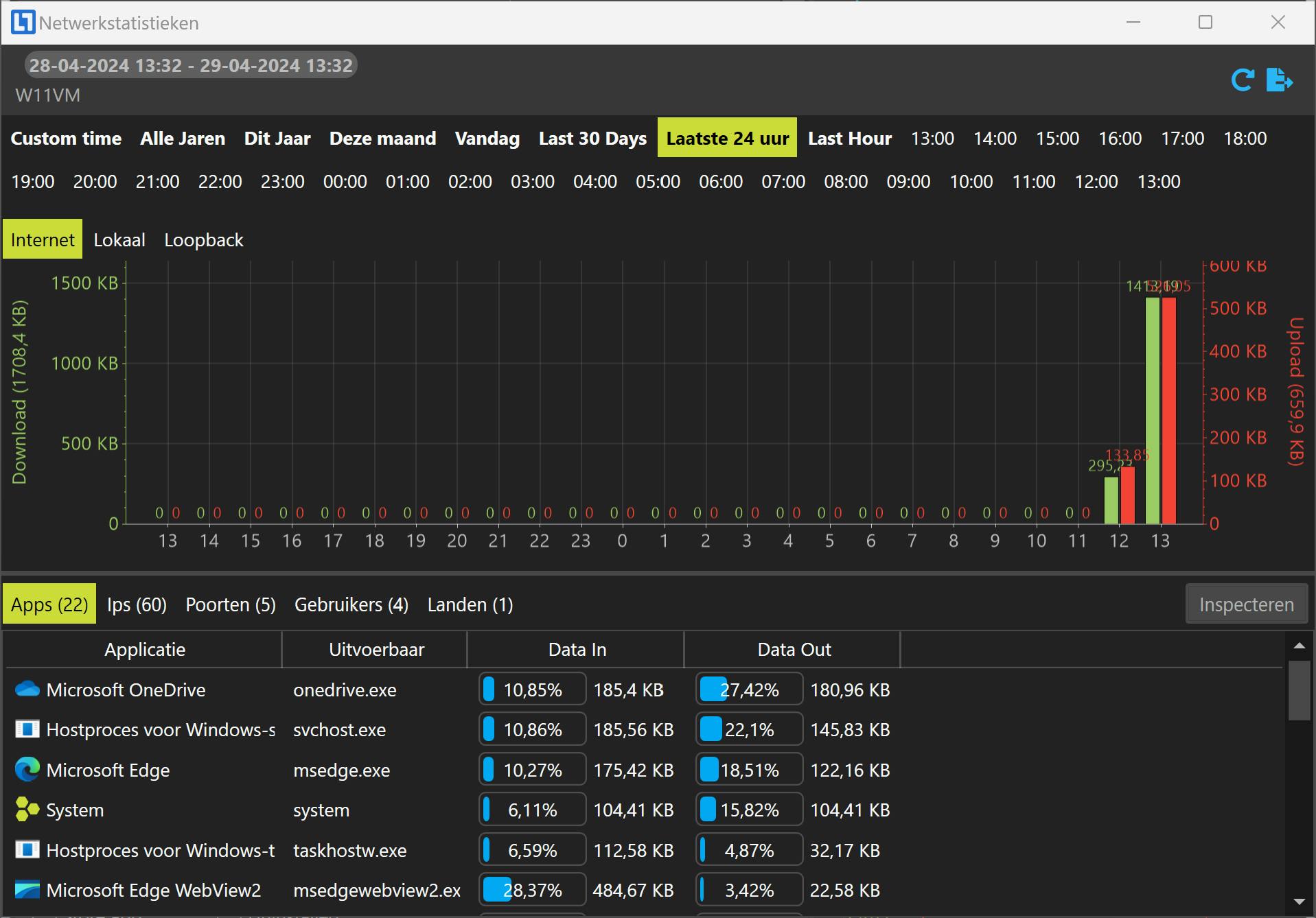 NetLimiter heeft een uitgebreid onderdeel met statistieken, die onder meer laten zien hoe het netwerkverkeer zich heeft ontwikkeld op uurniveau. Ook zie je welke programma’s de verbinding gebruiken. Je kunt zelf de perioden aanpassen, bijvoorbeeld om de statistieken van de afgelopen 24 uur of van de afgelopen 30 dagen te zien. Via de exportknop rechtsboven in het venster exporteer je de statistieken naar een kommagescheiden document.