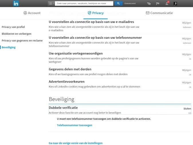 Om tweestapverificatie aan je LinkedIn account toe te voegen moet je op de dienst inloggen in je browser. Beweeg de cursor over je profielfoto rechts bovenaan het scherm. Je krijgt dan een aantal opties te zien. Klik naast Privacy & instellingen op Beheren. Klik op het tabblad Privacy en scrol omlaag naar de header Beveiliging en klik op Dubbele verificatie.