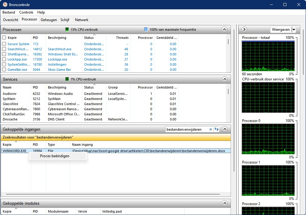 Weet je om welke applicatie of proces het gaat en kun je de bijbehorende toepassing sluiten, dan is je probleem opgelost. Heb je geen idee, druk dan op Windows-toets+R en voer Resmon uit. In het venster van Broncontrole open je het tabblad Processor en tik je rechts op de balk Gekoppelde ingangen (een deel van) de ‘gegijzelde’ bestandsnaam in. Als het goed is, verschijnen in de kolommen Kopie en PID de naam en de ‘process identifier’ van de dader. Klik op deze ingang met de rechtermuisknop en kies Proces beëindigen, waarna het bestand zich wél laat verwijderen.