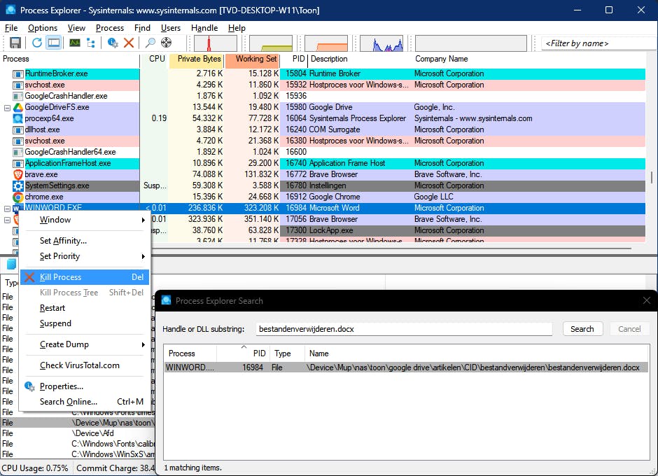 Process Explorer behoort tot de eerste categorie. Pak het gedownloade zip-archief uit en start procexp64.exe op. Ga naar Find / File Handle or DLL of druk op Ctrl+Shift+F en tik (een deel van) de bestandsnaam in. Zowel de procesnaam als de PID verschijnt, waarna je dit in het hoofdvenster kunt opzoeken in de kolommen Process of PID en vanuit het contextmenu met Kill Process kunt afsluiten.