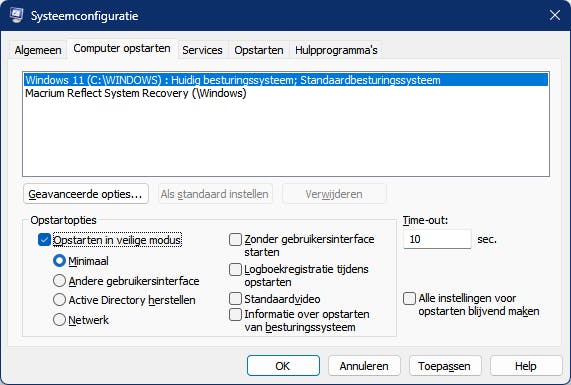Nog steeds niet? Dan lukt het vast door Windows in Veilige modus op te starten. Druk op de Windows-startknop, tik systeemconfiguratie in de zoekbalk in en start de applicatie op. Open Computer opstarten, plaats een vinkje bij Opstarten in veilige modus, laat Minimaal geselecteerd en druk op OK. Sluit nu eerst alle geopende applicaties af en bevestig met Opnieuw opstarten.