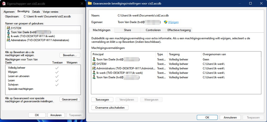 Meld je als administrator aan bij Windows. Navigeer met Verkenner naar het bestand. Rechtsklik hierop en kies Eigenschappen. Ga naar het tabblad Beveiliging om de accounts met de machtigingen te zien. Staat je eigen account ertussen, selecteer het dan, druk op Bewerken en plaats een vinkje bij Volledig beheer in de kolom Toestaan. Bevestig met OK (2x).