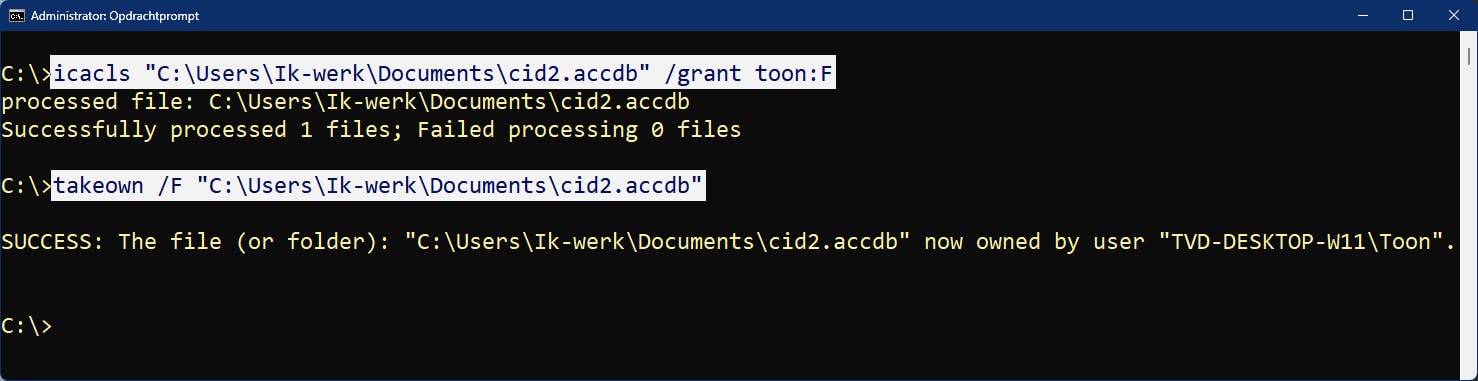In uitzonderlijke gevallen kan het gebeuren dat je de bestandsmachtigingen vanuit de grafische Verkenner-omgeving niet goed krijgt. In dat geval lukt het wellicht alsnog vanuit de Opdrachtprompt, die je als administrator dient uit te voeren.