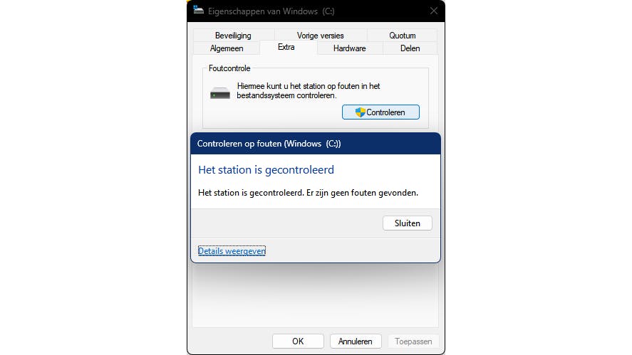 Schrikken opdrachtregelcommando’s je wat af, dan kan het ook als volgt. Open Verkenner, klik op Deze pc in het navigatiedeelvenster, klik met de rechtermuisknop op het gewenste station en kies Eigenschappen. Ga naar Extra en druk op Controleren / Station scannen. Na afloop krijg je nog de mogelijkheid om eventueel gedetecteerde fouten te herstellen. Klik op Details weergeven om de scanresultaten van het uitgevoerde commando chkdsk in de Windows Logboeken te consulteren.