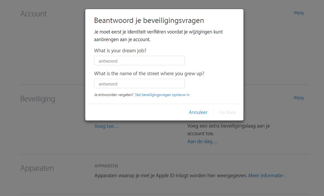 Als je twee-staps-verificatie hebt ingesteld hoef je de beveiligingsvragen niet langer te onthouden, omdat je alleen nog maar in hoeft te loggen met je wachtwoord, de toegangscode die naar je vertrouwde apparaten gestuurd is en je herstelcode.