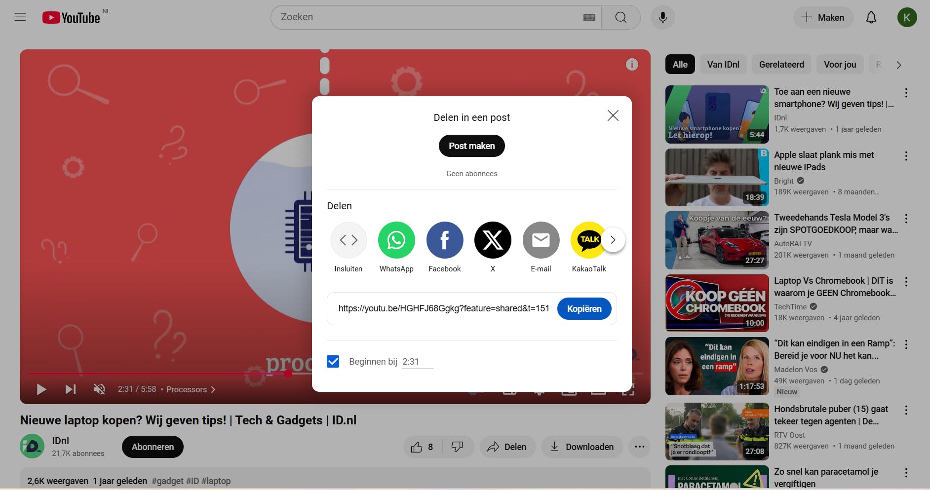 Op de computer kun je een YouTube-video pauzeren op een bepaald punt, met de rechtermuisknop op de video klikken en kiezen voor Video-URL kopiëren vanaf huidig tijdstip. Hetzelfde kun je overigens doen door op de knop Delen drukken, te kiezen voor Beginnen bij [tijdscode] en de link te kopiëren.