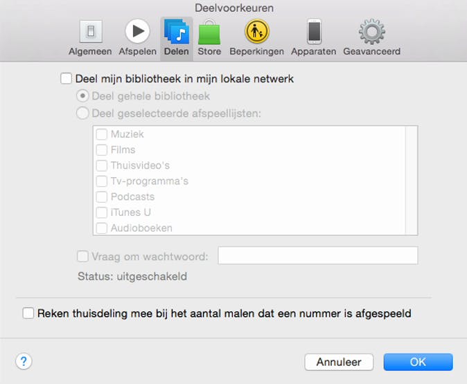 Het delen van je bibliotheek via je thuisnetwerk is heel handig als je iTunes gebruikt als server voor de rest van het netwerk, maar anders kun je de functie net zo goed uitschakelen omdat deze uitbundig gebruik maakt van de systeembronnen. Dit kan onder iTunes > Voorkeuren op het tabblad Delen.