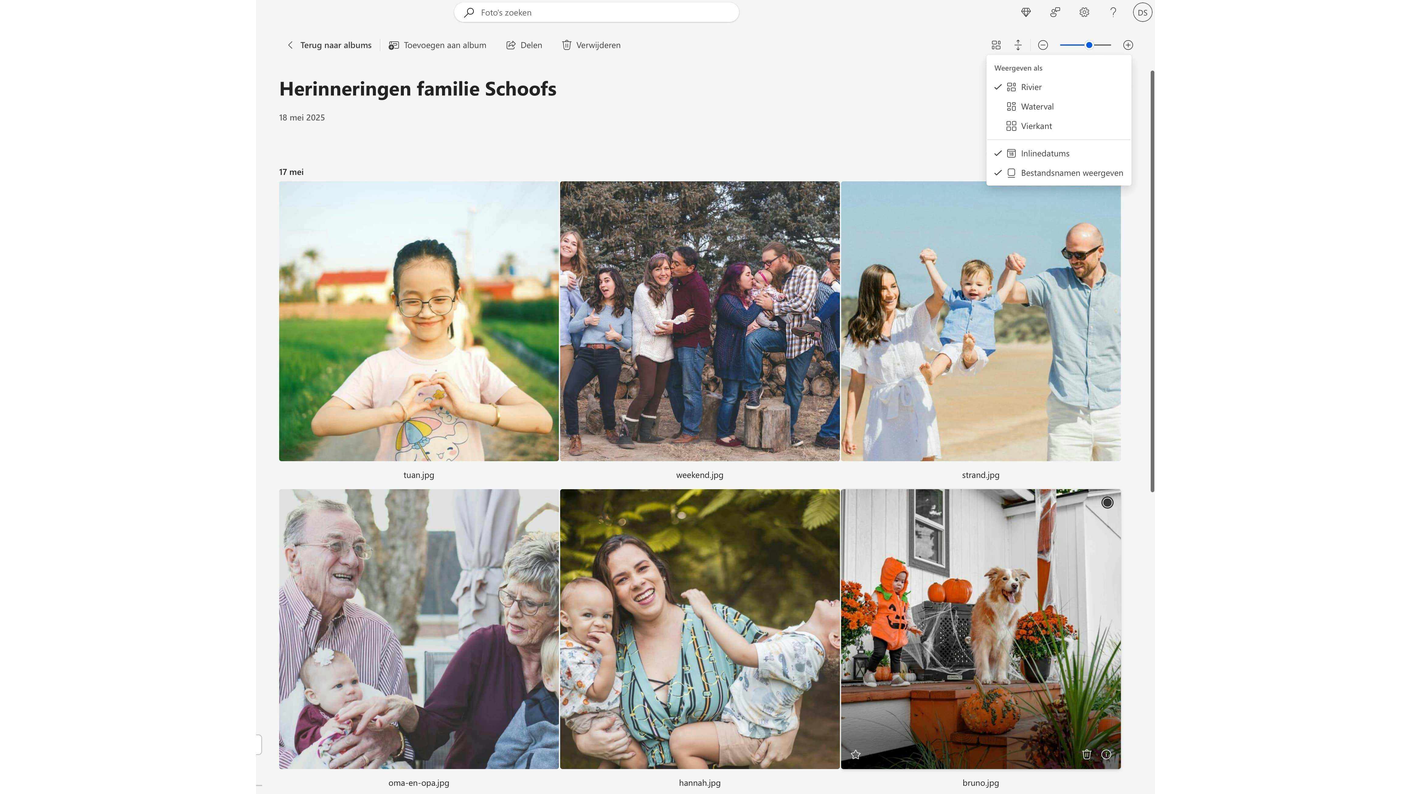 Nadat je je foto's en filmpjes hebt geüpload, helpt OneDrive je deze te organiseren. Je kunt ze in de galerij bekijken in verschillende weergaven. Die weergave kies je via een knop rechtsboven: Indeling selecteren. Je hebt de keuze uit drie weergavestijlen: Rivier, Waterval of Vierkant. Het is ons een raadsel waar die namen op slaan. Probeer deze opties gewoon om te zien wat jou het meeste bevalt.