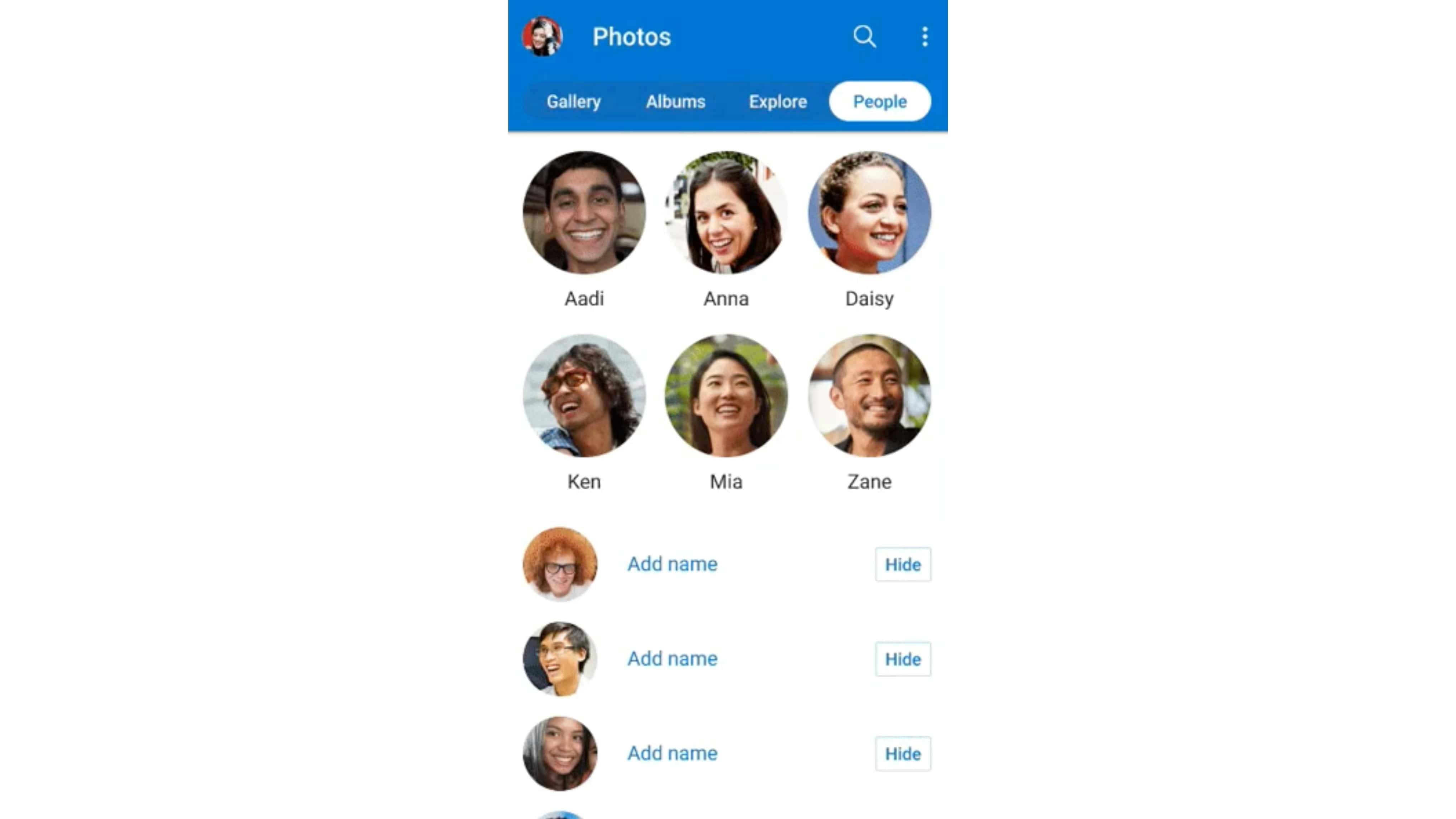 Zodra je de namen hebt toegevoegd, kun je eenvoudig zoeken naar alle foto's waarop specifieke personen staan. Deze gezichtsinformatie valt onder de privacy-instelling. Dat wil zeggen dat jij alleen de gezichtsgroepen kunt zien. Wanneer je een foto of een album deelt met familieleden, worden deze gezichtsgroepen niet gedeeld.