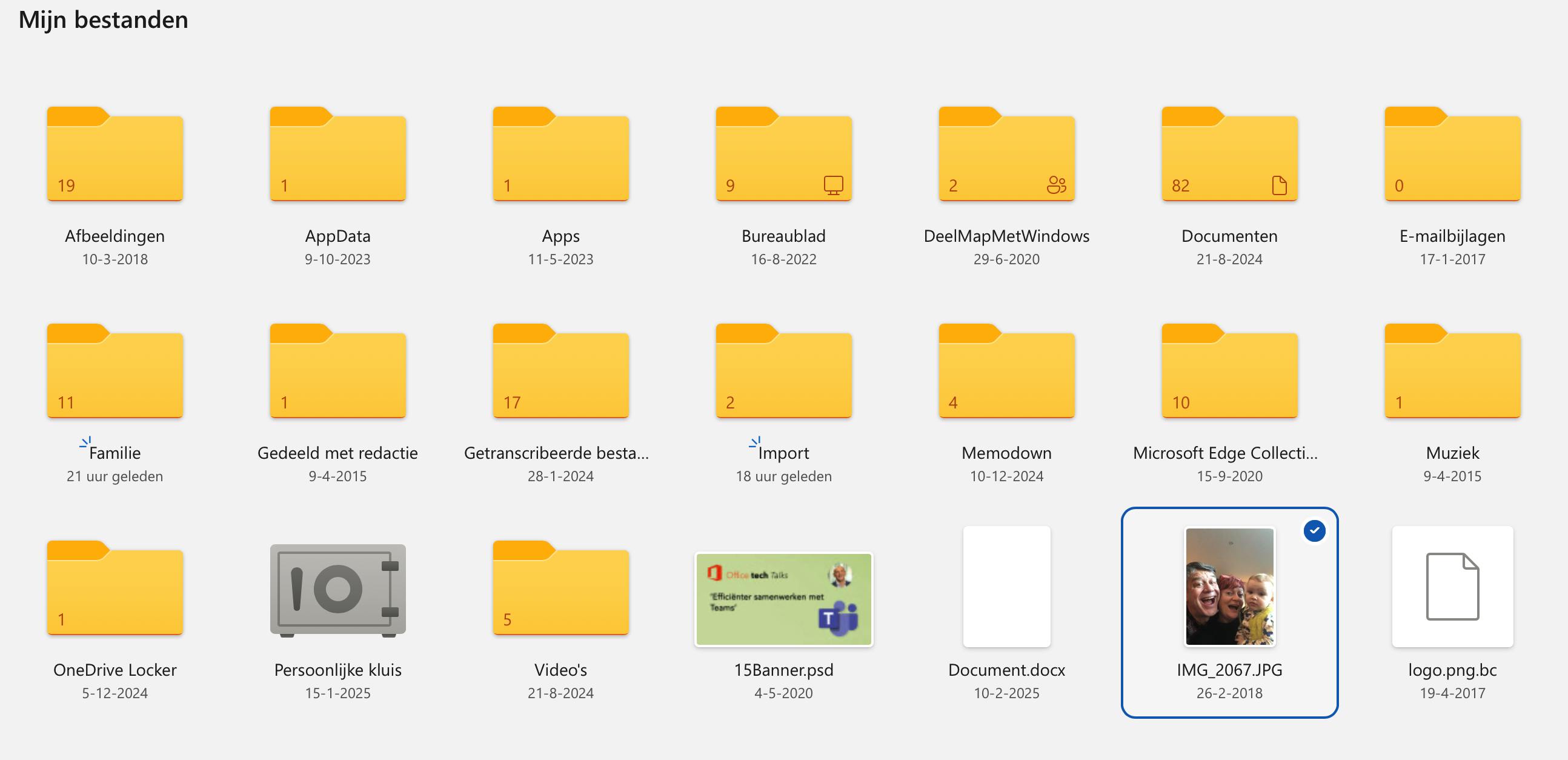 In het tabblad Albums zie je dat ieder album wordt weergegeven met een coverfoto. Hier noemen ze dat de Omslagfoto. Normaal gesproken genereert OneDrive automatisch afwisselende omslagfoto's op basis van de inhoud, maar je kunt zelf ook een specifieke afbeelding selecteren als vaste omslag. Dit helpt om de albums visueel te organiseren en ze sneller te herkennen.