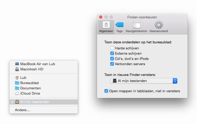 Telkens wanneer je in de Finder een nieuw venster opent, wordt dezelfde map weergegeven. Gewoonlijk is dit [b]Bureaublad[/b] of [b]Al mijn bestanden[/b], maar het is ook mogelijk om een andere map te kiezen. Dit is bijvoorbeeld handig wanneer je meestal in één bepaalde map moet zijn.