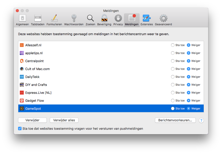 Als je Safari hebt geopend klik je in de menubalk op Safari > Voorkeuren > Meldingen. Nu zie je een lijst met websites die jou ooit om toestemming hebben gevraagd om notificaties te sturen en of je ze toestemming hebt gegeven of niet. Zo kun je achteraf notificaties toestaan of juist weigeren en websites in hun geheel van de lijst verwijderen.