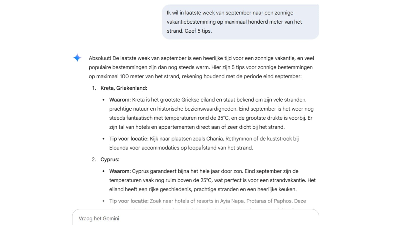 Bij het vinden van een geschikte vakantie typ je bijvoorbeeld een wensenlijst. Zeg bijvoorbeeld dat je in de laatste week van september een zonnige vakantiebestemming op maximaal honderd meter van het strand zoekt. Je merkt al gauw dat je helemaal niet zo veeleisend bent, want de chatrobots tonen heel wat suggesties. Zo zijn Google Gemini en ChatGPT het erover eens dat Kreta (Griekenland) en Cyprus prima vakantiebestemmingen zijn met veel hotels aan de kust.