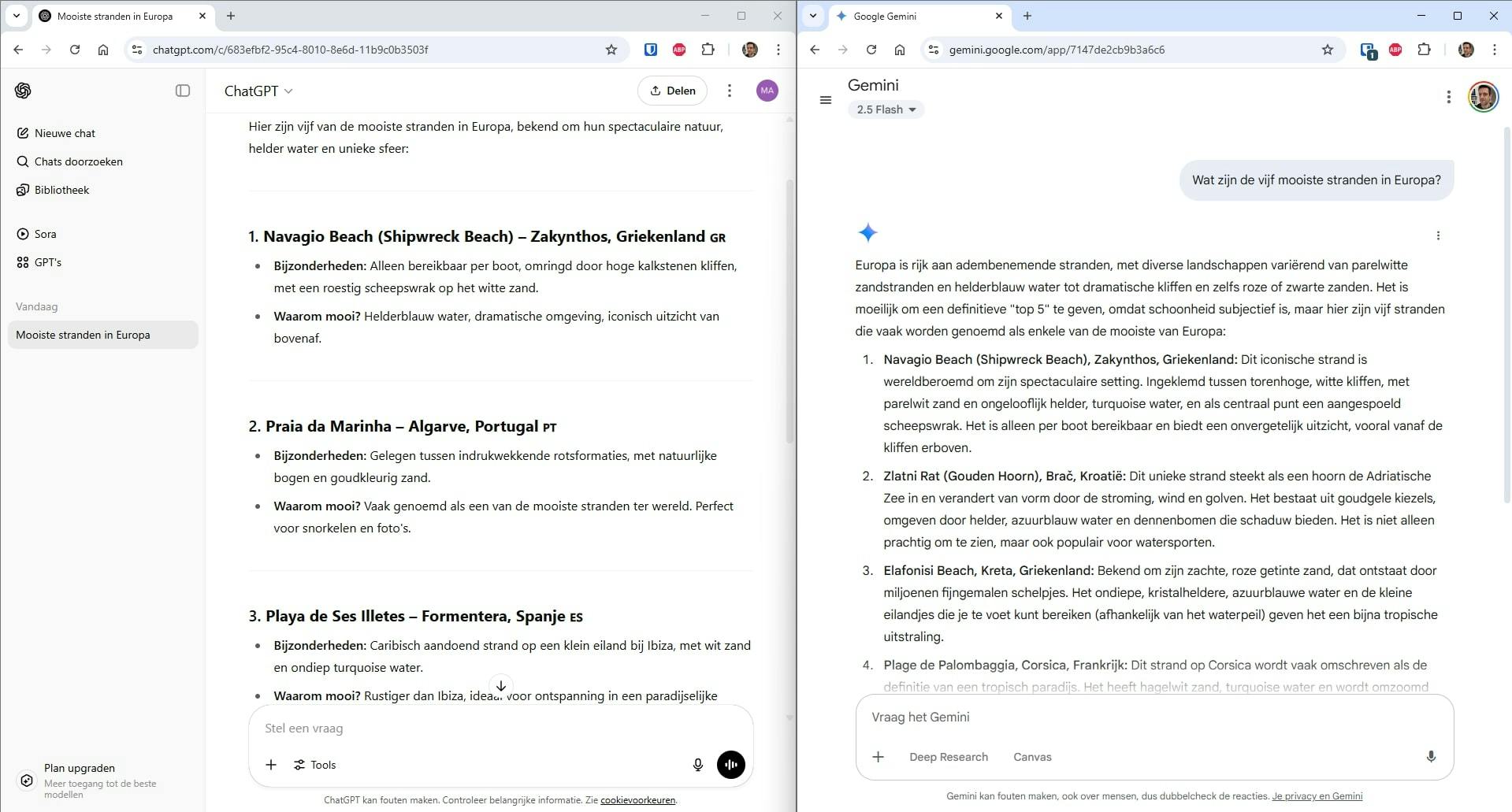 Misschien merk je dat ChatGPT en Google Gemini doorgaans niet precies dezelfde antwoorden geven? Dat is logisch, want op een vraag als Wat zijn de vijf mooiste stranden in Europa? valt geen feitelijk antwoord te geven. De AI-diensten gebruiken openbare informatie op internet en stellen vervolgens op eigen houtje een lijstje samen. Je mag er wel van uitgaan dat de genoemde stranden door flink wat websites over reizen hoog worden gewaardeerd.