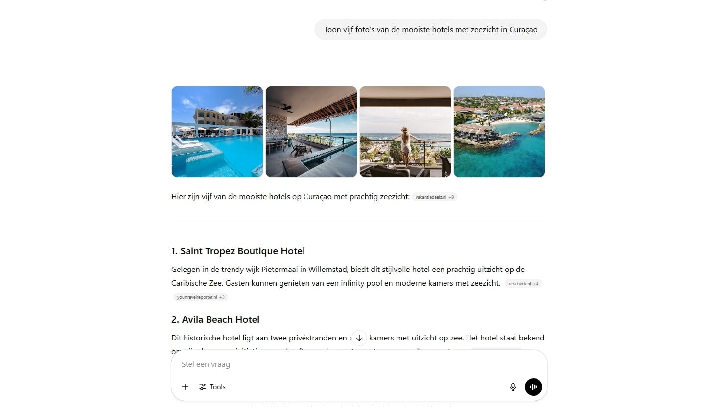 Bij het zoeken naar vakanties horen natuurlijk adembenemende beelden van bijvoorbeeld hagelwitte stranden en blauwe oceanen. Behalve het genereren van tekst kunnen AI-diensten ook foto's tonen. Typ bijvoorbeeld Toon vijf foto's van de mooiste hotels met zeezicht in Curaçao. De resultaten zijn erg verschillend. Zo laat Google Gemini vijf ietwat algemene kiekjes met bijbehorende websites zien. De links verwijzen naar artikelen op reisblogs, waardoor je niet meteen ziet om welke hotels het gaat. ChatGPT neemt meer tijd om mooie plaatjes te zoeken. Bovendien verschijnt er hierbij ook een lijstje met relevante hotels.