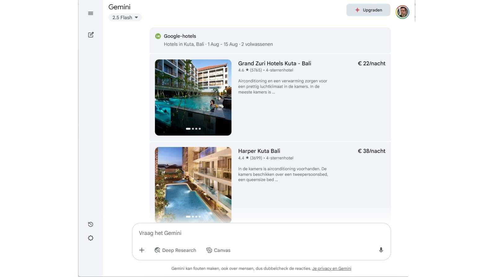 Wanneer je een hotel zoekt, heeft het ook zin om reisdata aan een prompt toe te voegen. Je ziet zo welke accommodaties er in de gewenste periodes nog vrij zijn. Vooral Google Gemini toont in dat geval goede resultaten. Overigens is dat niet zo vreemd, want in de AI-dienst is een koppeling naar www.google.com/travel verwerkt. Je ziet direct hoeveel geld je voor een kamer betaalt. Je kunt eventueel ook een prijsvergelijking van de goedkoopste hotels in een bepaalde stad opvragen. ChatGPT vermeldt trouwens geen actuele prijzen. De dienst verwijst hiervoor naar bekende boekingswebsites, zoals Booking.com en Expedia.