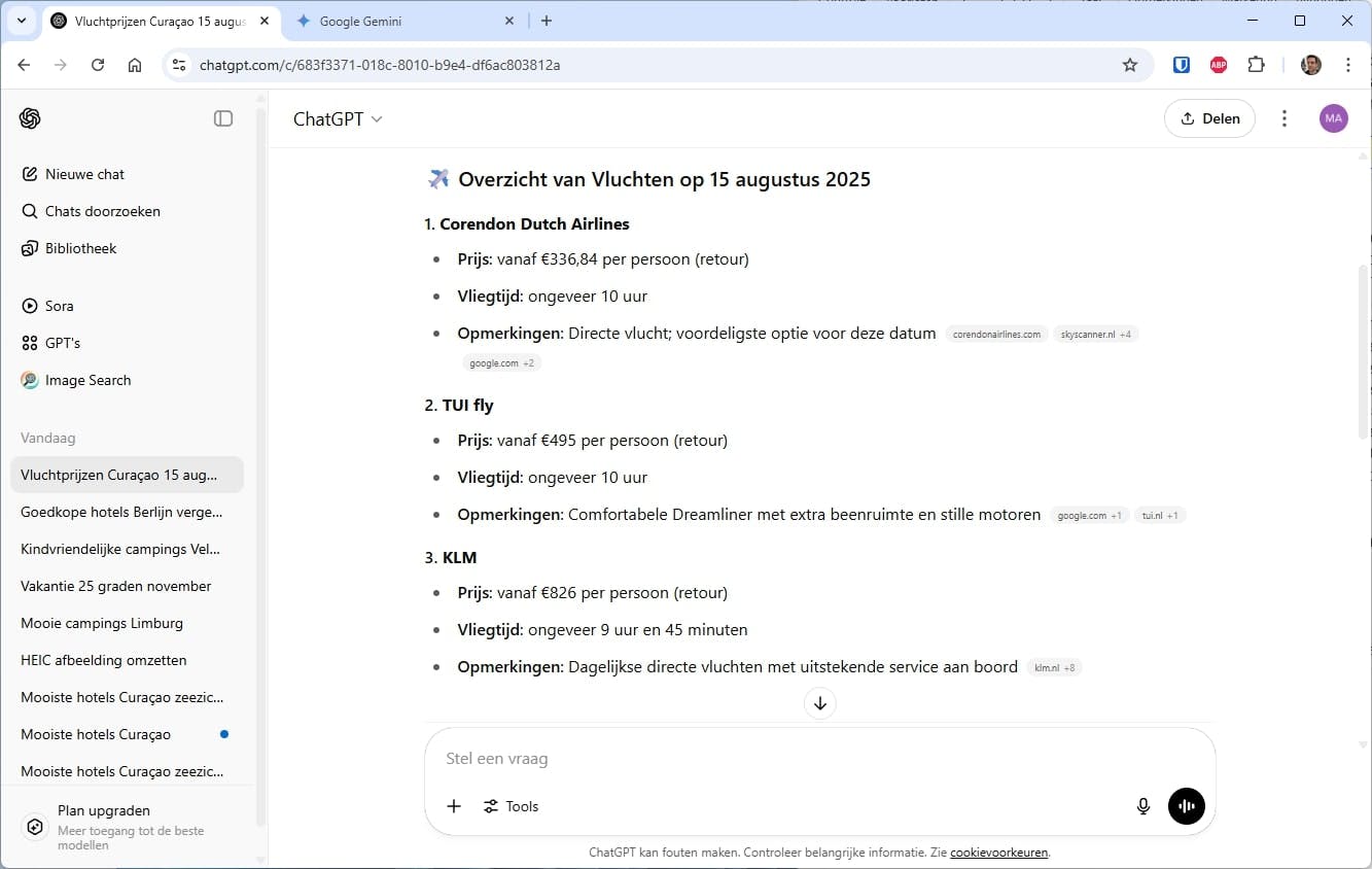 Zodra je een reisbestemming en accommodatie hebt gevonden, heb je mogelijk alleen nog een vliegticket nodig. Google Gemini toont zeer gedetailleerde resultaten. Typ zoiets als Vergelijk de prijzen en tijden voor vluchten naar Curaçao op 15 augustus voor 2 volwassenen. Je ziet precies de exacte vertrek- en aankomsttijden. Net als bij hotels is er wederom een koppeling naar www.google.com/travel beschikbaar. Je kunt hier doorklikken naar de betreffende luchtvaartmaatschappij en vervolgens de tickets bestellen. Google ontvangt hiervoor commissie.